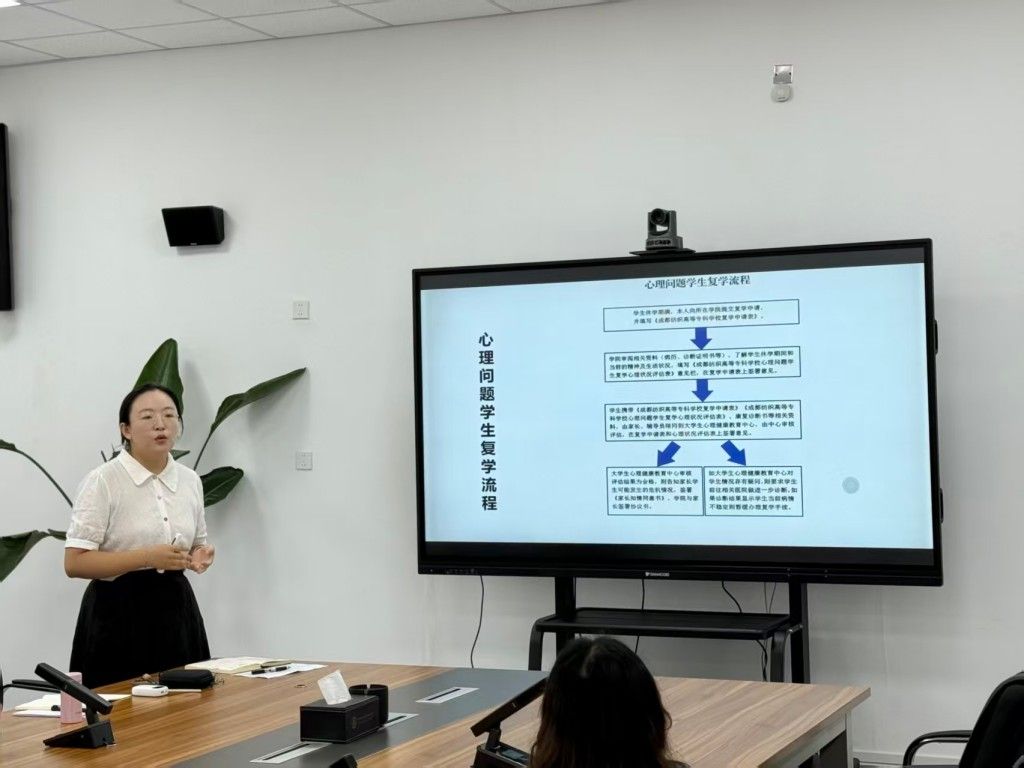 为切实推动心理育人工作取得实效,系统部署新学期大学生心理健康教育各项重点任务,9月25日和9月15日,学校分别在犀浦校区明德楼第四会议室和邛崃产教园区召开了新学期心理健康工作主题研讨会。此次会议由学创处主持工作副处长杨舜如主持,学校党委常委、副校长蒲冰远出席会议并讲话。各学院书记、副书记、负责心理工作的辅导员、新生班辅导员以及心理健康中心专职教师参会。