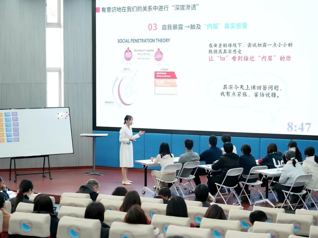 本次比赛分为本科组和高职组,设置现场授课与教学反思撰写两大环节,注重考察课程内容创新、教学方法优化、课程思政融合以及人工智能应用等多维能力,全面检验教师的专业功底与育人水平。刘颖婕老师紧扣大学生心理发展规律,将理论知识与真实案例有机融合,通过学科严谨的教学设计,以及生动有趣的课堂展示,赢得了评委与现场师生的广泛好评。