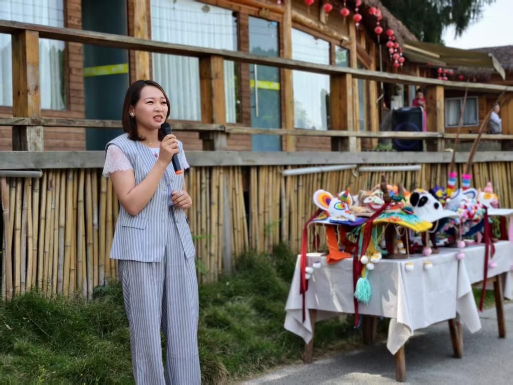 活动现场,前锋村的文化广场化身为非遗艺术的秀场,一件件精美的非遗农民画花帽子惊艳亮相。这些融合传统美学与现代设计的作品,由简阳前锋村农民画非遗传承人张树敏老师匠心构思,再经成都纺织高等专科学校师生团队手工制作完成。从设计图纸到立体成品,每个环节都凝聚着校地双方的智慧与汗水,更成为劳动教育的鲜活课堂。张树敏老师率先登台,讲述花帽设计背后的文化密码,带领在场观众领略非遗艺术的深厚底蕴;成都纺织高等专科学校学生管理与就业创业工作处副处长(主持工作)杨舜如则从校地合作视角,深入解读劳动教育在非遗传承中的实践价值。她强调,下一步,学校将与前锋村深化合作,持续推动“农民画+”产业链延伸——从亲子研学到数字文创,从民宿设计到社区营造。未来以此次“四季串门计划”为契机,打造“非遗创客孵化器”,制作农民画手工帽材料包,供研学、景区等使用,并按照季节开放新品,让高校的智力资源像四季更替般自然流入乡村,让乡村振兴成为永不停歇的接力赛。