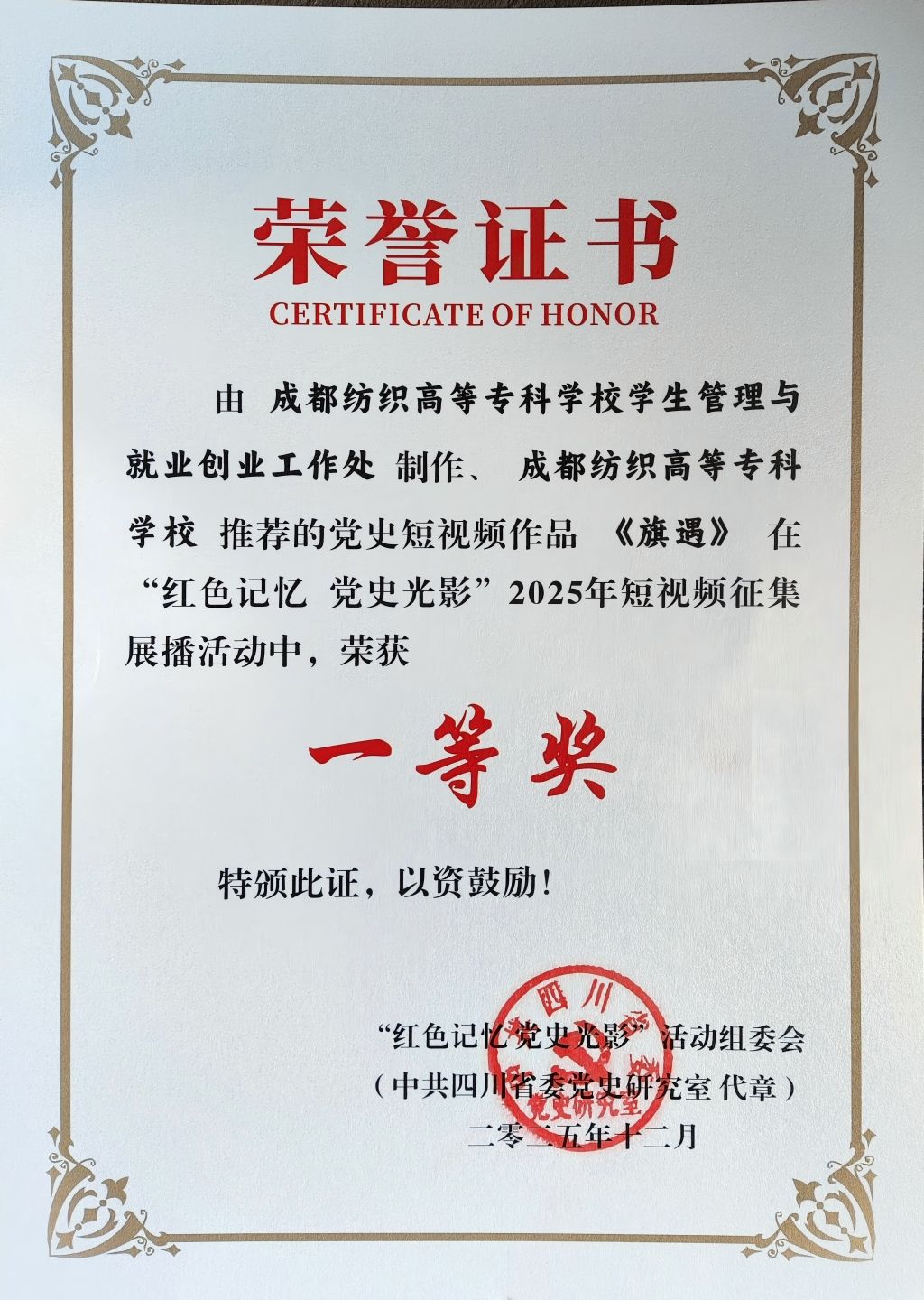 12月11日,由中央党史和文献研究院第七研究部指导,四川省委党史研究室等多部门联合主办的“红色记忆 党史光影”2025年四川省优秀党史短视频展播暨主题党课活动在攀枝花市圆满落幕。我校报送的原创短视频《旗遇》,从全省955部参赛作品中脱颖而出,成功斩获一等奖。